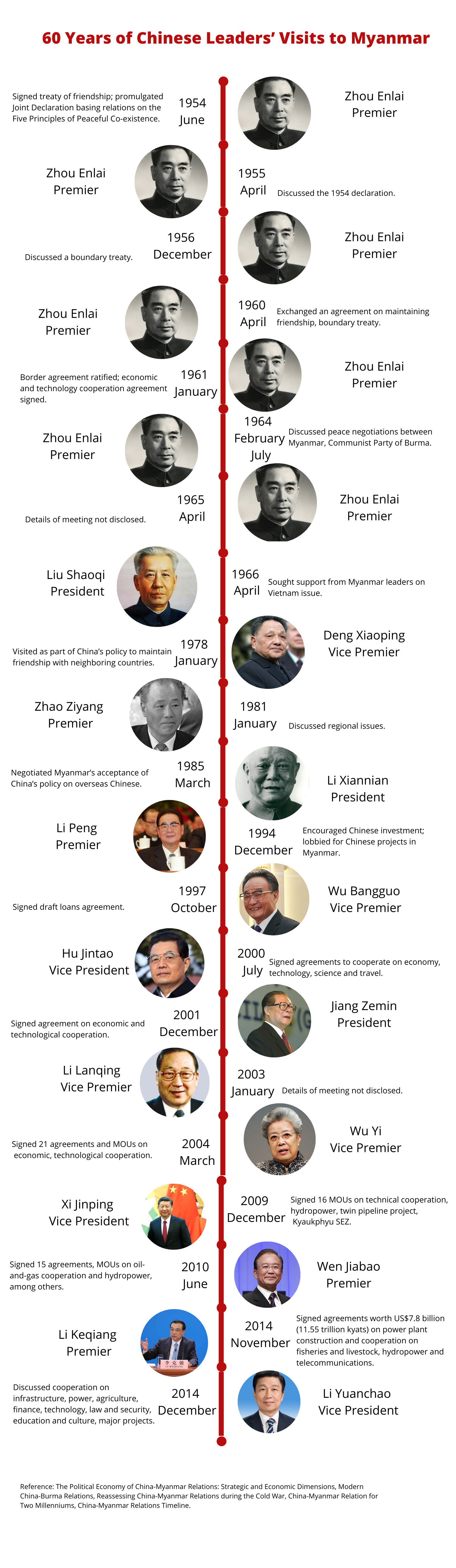 တရုတ်ထိပ်တန်းခေါင်းဆောင်များ မြန်မာနိုင်ငံသို့ ဆယ်စုနှစ်ခြောက်ခုအတွင်း လာရောက် လည်ပတ်ခြင်းနှင့် သက်ရောက်မှုများကို အောက်တွင် အင်္ဂလိပ်ဘာသာဖြင့် ဖော်ပြထားသည်။