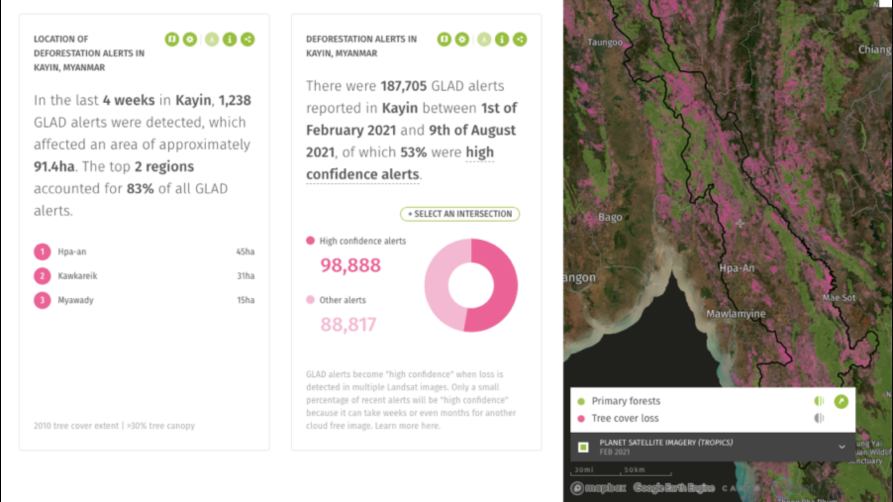 အာဏာသိမ်းပြီးနောက်ပိုင်း ကရင်ပြည်နယ်အတွက် သစ်တောပြုန်းတီးမှု သတိပေးချက် ၁၈၇၇၀၅ ခုရှိပြီး ၎င်းတို့အနက် ၅၃ ခုသည် ပြင်းထန်သော သတိပေးချက်များဖြစ်သည်