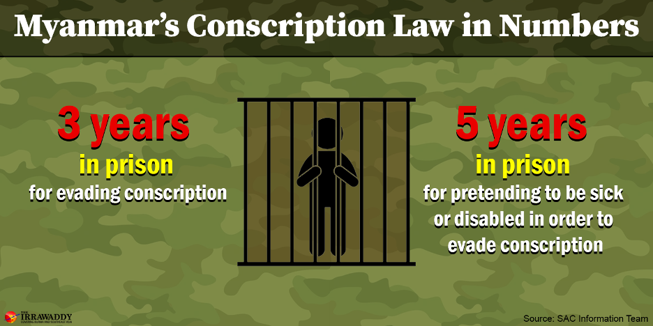 စစ်မှုထမ်းတာကို ရှောင်တိမ်းရင် ထောင် ၃ နှစ်ကနေ ၅ နှစ်အထိချပြီး ဒဏ်ငွေရိုက်လို့ရတယ်။ စစ်မှုထမ်းတာကို ရှောင်ရှားဖို့ ကျန်းမာရေးမကောင်း ဒါမှမဟုတ် မသန်စွမ်းဟန်ဆောင်ရင် ထောင် ၅ နှစ်အထိ ချလို့ရတယ်။