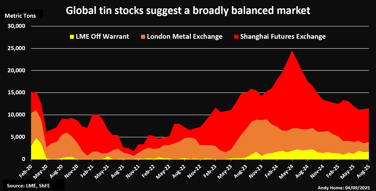 သို့သော် မိုင်းမောမှ ဆုံးရှုံးမှုသည် ကုန်စည်ဖြန့်ချိရေးကွင်းဆက်၏ သန့်စင်ပြီး သတ္တုကဏ္ဍတွင် သိသာသော ကျပ်တည်းမှု မဖြစ်စေသေးပေ။ ကမ္ဘာ့သံဖြူလက်ကျန်သည် လွန်ခဲ့သော သုံးလအတွင်း တန်ချိန် ၁၁,၀၀၀ အထက်တွင် တည်ငြိမ်နေပြီး ၂၀၂၁ ခုနှစ်က သံဖြူလက်ကျန် တန် ၁,၀၀၀ အထိ လျော့ကျသည့် အမှန်တကယ် ရှားပါမှုအထက် များစွာ ပိုမိုရှိနေသည်။