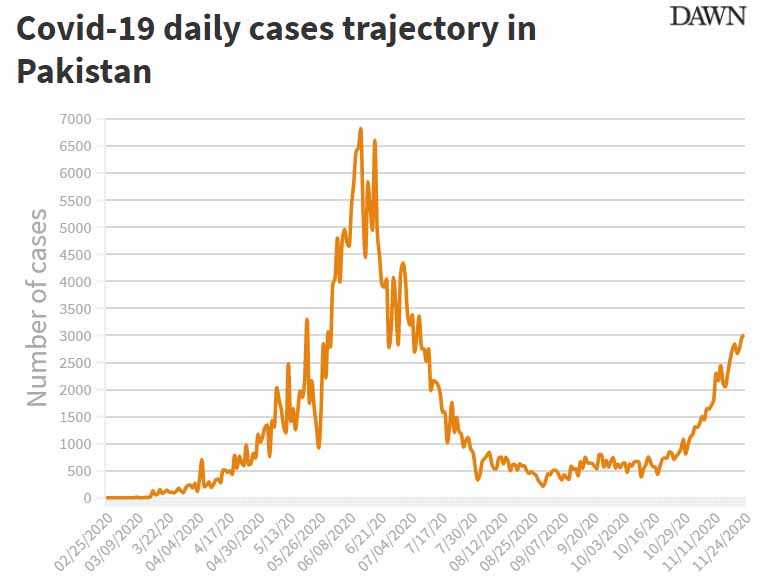 နိုဝင်ဘာ ၂၄ ရက်မှာ အများဆုံးကူးစက်ခံထားရတဲ့ ဒေသကတော့ နိုင်ငံအနောက်တောင်ပိုင်းရှိ Sindh ခရိုင် ဖြစ်ပြီး ကူးစက်ခံရသူ ၁,၃၀၀ ကျော်နဲ့ သေဆုံးသူ ၁၃ ဦးထိ ရှိခဲ့ပါတယ်။ ဝန်ကြီး Asad Umar ကတော့ ကာကွယ်ရေး အစီအမံတွေ လိုက်နာမှု မရှိရင် နောက်ထပ် ၂ ပတ်အတွင်း အဆိုးဆုံးအခြေအနေတွေကို ရင်ဆိုင်ရနိုင်တယ်လို့ ဆိုပါတယ်။