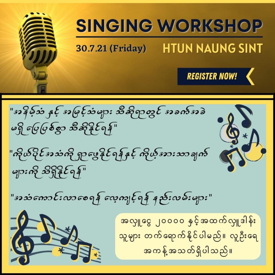 အဆိုပါ “Singing Workshop” ကို လာမယ့် ဇူလိုင် ၃၀ ရက်နေ့မှာ ပြုလုပ်မှာဖြစ်ပြီး၊ ၂ နာရီစာ ပြုလုပ်မယ့် Workshop အတွင်း စာတွေ့ ၂ နာရီစာ သင်ကြားမှုနဲ့ လက်တွေ့ သင်ကြားခြင်း တရက်ကို ထပ်မံ ပြုလုပ်သွားမယ်လို့ သိရပါတယ်။