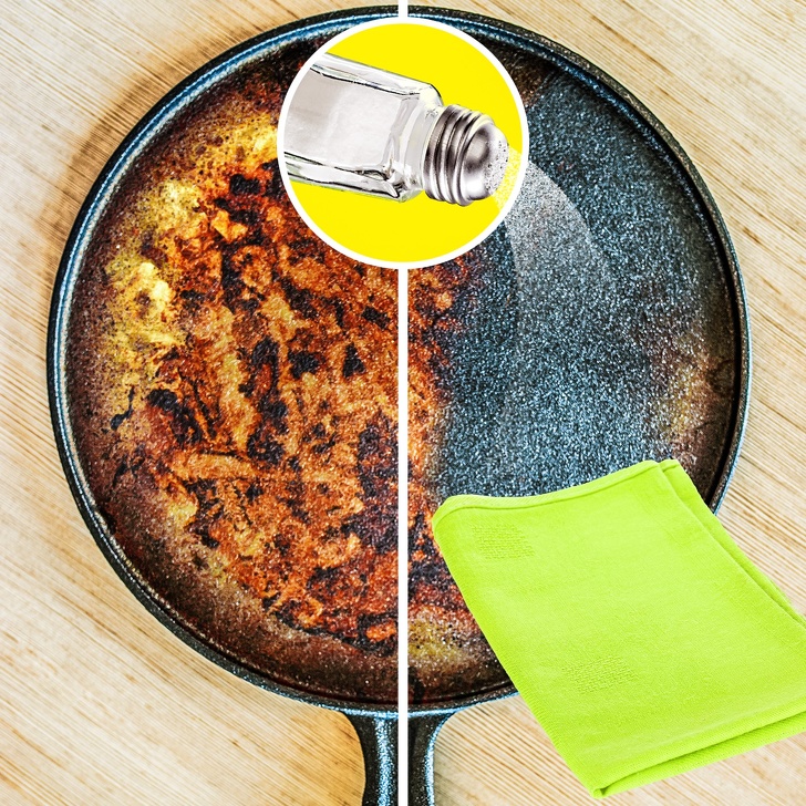 (၁) ဒယ်အိုးတွေမှာ ချိုး(ဂျိုး) တွေ ကပ်နေရင် ဆားတဇွန်းလောက်ကို အဲဒီ ချိုးကပ်နေတဲ့ နေရာမှာ ဖြန်းပြီး အဝတ်စတခုနဲ့ ပြောင်တဲ့အထိ ပွတ်နိုင်ပါတယ်။ ပြီးသွားရင်တော့ ဒယ်အိုးကို ဆေးနေကျ ပုံစံအတိုင်း ဆေးကြောလိုက်ပါ။