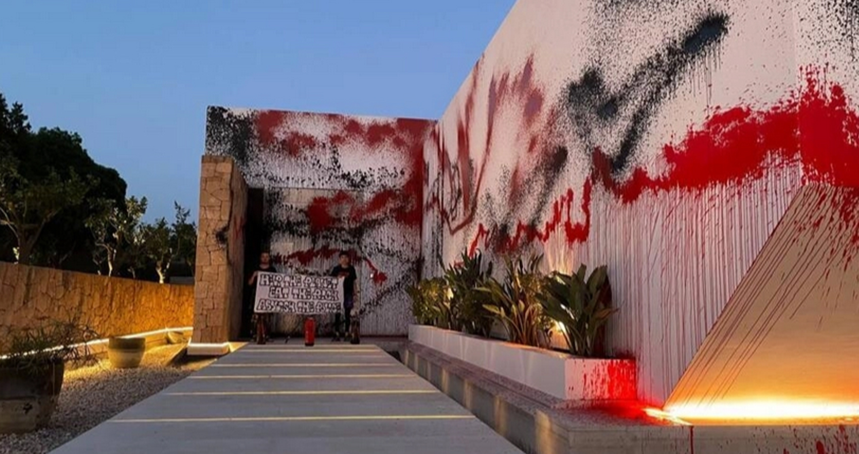 ရာသီဥတု ပြောင်းလဲမှု ဆိုင်ရာ တက်ကြွ လှုပ်ရှားတဲ့ Futuro Vegetal အမည်ရှိ အဖွဲ့က အဖြူရောင် အိမ်ရှေ့မျက်နှာစာကို ဆေးနီ ဆေးနက်တွေနဲ့ ဖြန်းပက်ပြီး ဆန္ဒဖော်ထုတ်ခဲ့တာလို့ ဆိုပါတယ်။