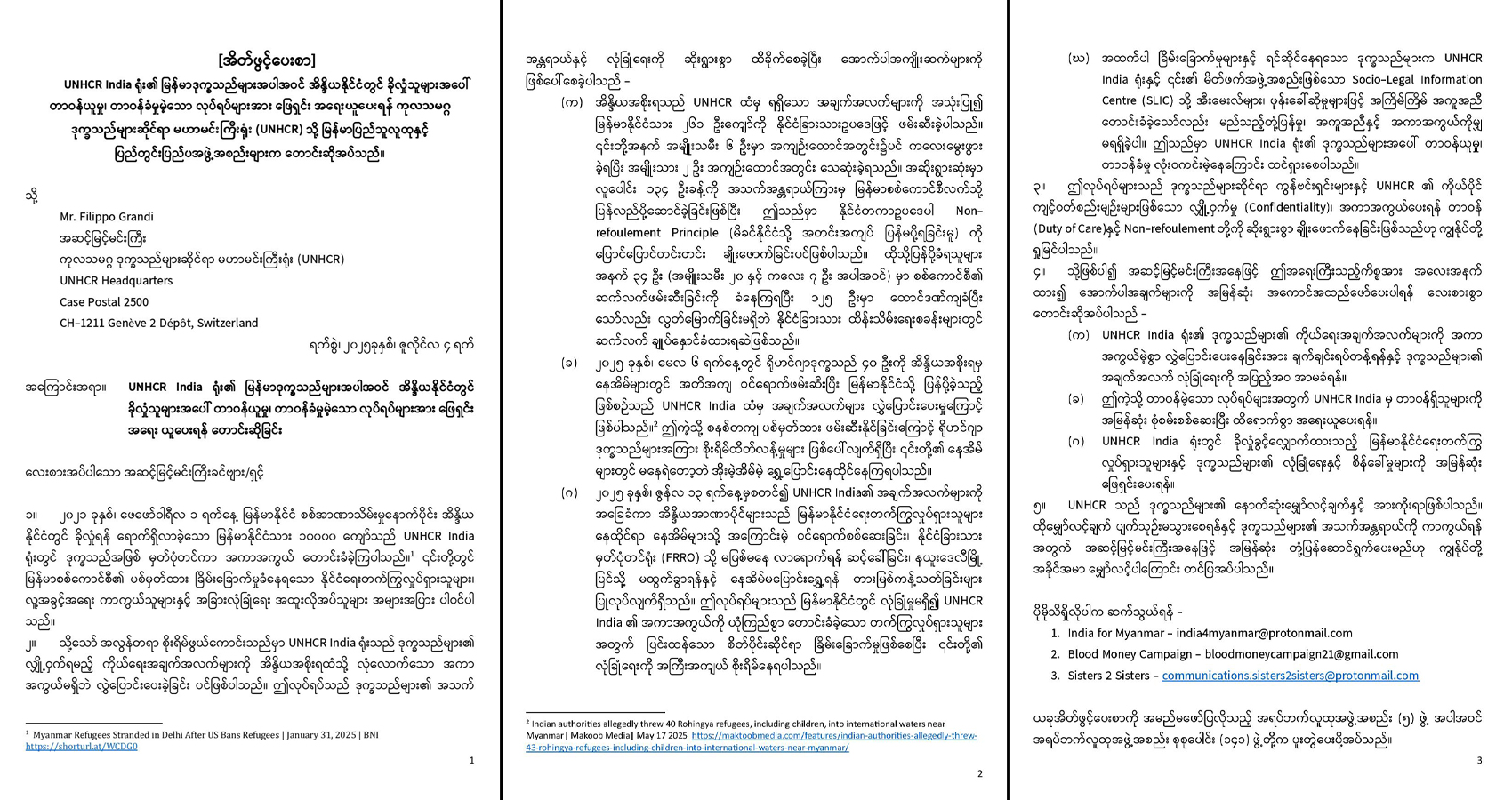 လုံလောက်သည့် အကာအကွယ်မရှိဘဲ အိန္ဒိယအစိုးရထံ ကိုယ်ရေးအချက်အလက်များပေးအပ်ခြင်းဖြင့် မြန်မာ့နိုင်ငံရေး တက်ကြွလှုပ်ရှားသူများနှင့် ဒုက္ခသည်များအပေါ် လုံခြုံရေးဆိုင်ရာ ခြိမ်းခြောက်မှုများဖြစ်စေခဲ့သော အိန္ဒိယအခြေစိုက် ကုလသမဂ္ဂ ဒုက္ခသည်များဆိုင်ရာ မဟာမင်းကြီးရုံး(UNHCR) တာဝန်ရှိသူများအား စုံစမ်းစစ်ဆေးအရေးယူပေးရန် မြန်မာ အရပ်ဘက်အဖွဲ့အစည်းများက ယနေ့ တောင်းဆိုလိုက်သည်။