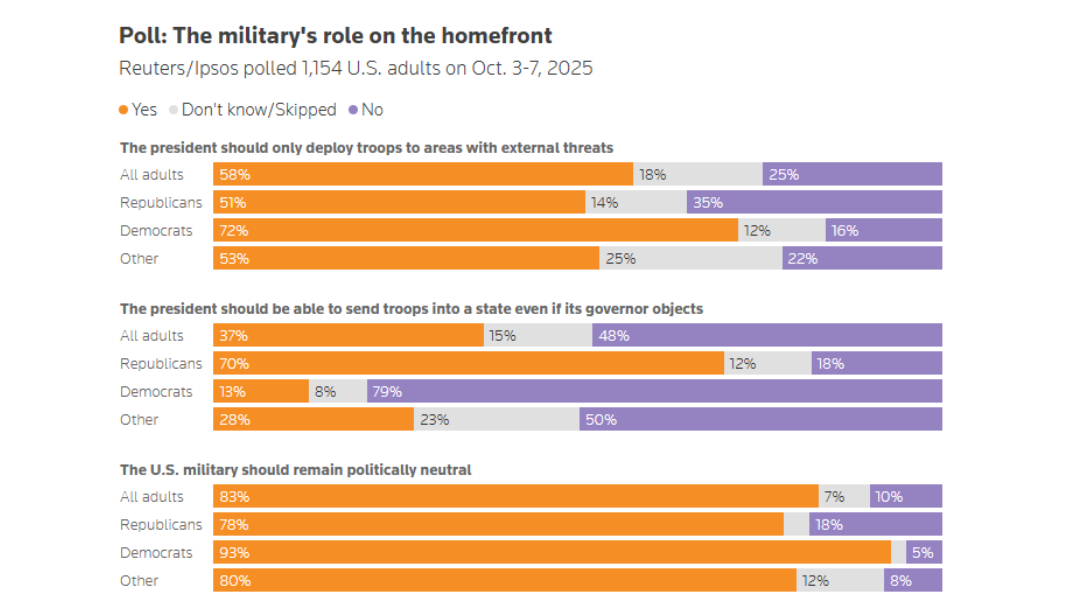 သမ္မတ ဒေါ်နယ် ထရမ့်သည် အမေရိကန်မြို့ကြီးများကို ထိန်းသိမ်းရန် အမျိုးသားအစောင့်တပ်များကို ပိုမိုဖြန့်ကြက်နေချိန်တွင် သမ္မတသည် ပြင်ပခြိမ်းခြောက်မှုနှင့် ရင်ဆိုင်ရသောအခါမှသာ စစ်တပ်ကို စေလွှတ်သင့်သည်ဟု ဒီမိုကရက် ၁၀ ဦးလျှင် ခုနစ်ဦးနှင့် ရီပတ်ဘလစ်ကန် ထက်ဝက် အပါအဝင် အမေရိကန် ၅၈ ရာခိုင်နှုန်းခန့်က ယူဆသည်ဟု Reuters/Ipsos စစ်တမ်းတခုက တွေ့ရှိသောကြောင့် စိတ်မသက်သာစရာ လက္ခဏာဖြစ်သည်။