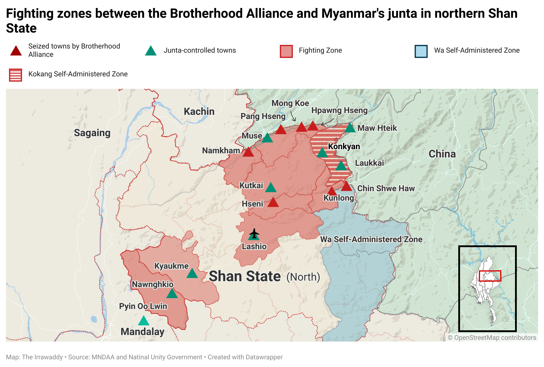 ရှမ်းပြည်နယ်မြောက်ပိုင်းမှ ကျယ်ပြန့်သောဒေသများကို မြောက်ပိုင်းမဟာမိတ် ညီနောင်များဖြစ်သည့် မြန်မာအမျိုးသား ဒီမိုကရက်တစ် မဟာမိတ်တပ်မတော် (MNDAA)၊ ရက္ခိုင့်တပ်တော် (AA) နှင့် တအာင်းအမျိုးသား လွတ်မြောက်ရေး တပ်မတော် (TNLA) တို့က သိမ်းပိုက်လိုက်ပြီး စစ်ကောင်စီကို တရုတ်နယ်စပ်နှင့် ဖြတ်တောက် ပိတ်ဆို့ထားလိုက်သောကြောင့် လွန်ခဲ့သော ရက်များအတွင်း မြန်မာနိုင်ငံမှ စစ်ရေးအခြေအနေ အကြီးအကျယ် ပြောင်းလဲသွားသည်။